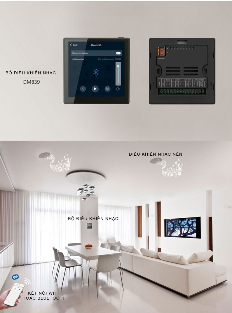 DM839 có màn hình hiển thị và điều khiển cảm ứng 4''LCD, hỗ trợ kết nối WIFI, cho phép điều khiển thuận tiện và hiển thị các chức năng rất rõ nét, chính xác. Hỗ trợ nhiều nguồn nhạc như FM, SD, BT và AUX, Bluetooth. Thiết bị đi kèm bộ điều khiển từ xa hồng ngoại để người dùng có thể điều khiển âm nhạc dễ dàng khi họ ngồi trên ghế sofa.