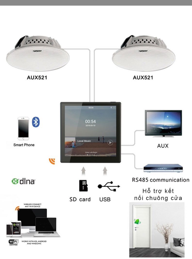 ● Một số chế độ âm nhạc: nhạc cục bộ, đài phát thanh qua mạng, APP nghe nhạc của bên thứ ba, BLUETOOTH, phát trực tuyến và AUX.
