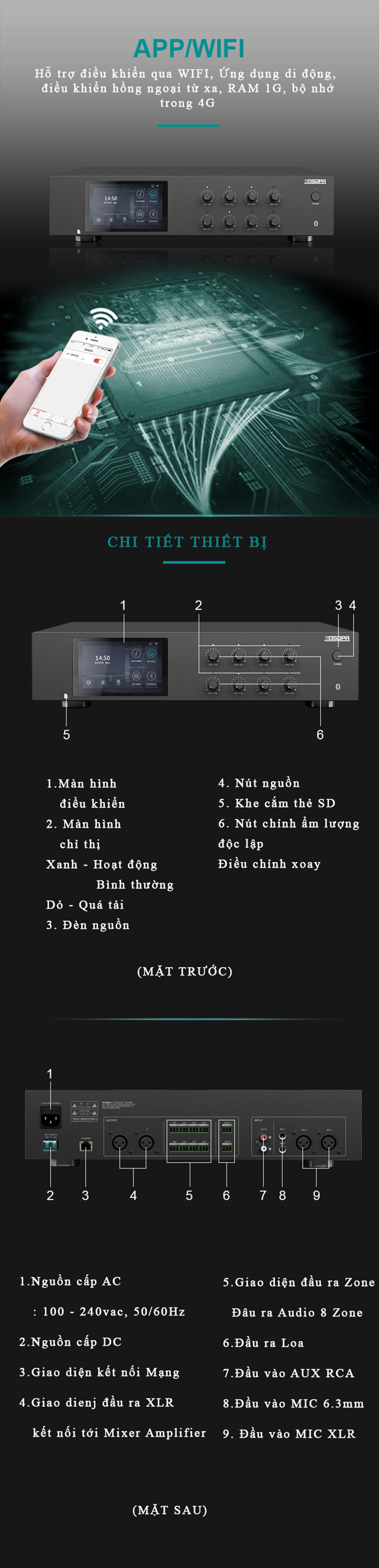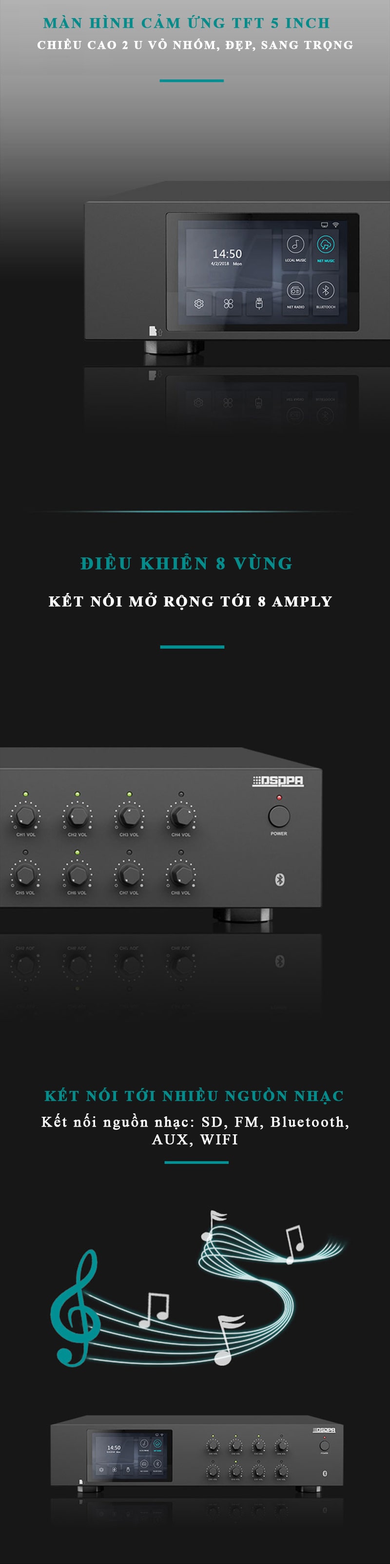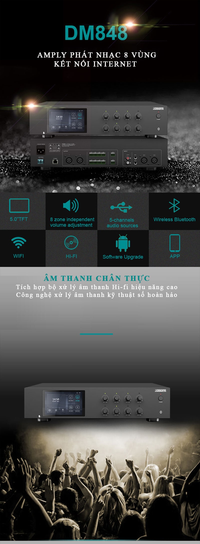 Bộ khuếch đại âm thanh gia đình thông minh DM848 có màn hình hiển thị và điều khiển cảm ứng 5''TFT, hỗ trợ kết nối WIFI, cho phép điều khiển thuận tiện và hiển thị các chức năng rất rõ nét, chính xác. Hỗ trợ nhiều nguồn nhạc như FM, SD, BT và AUX, Bluetooth.