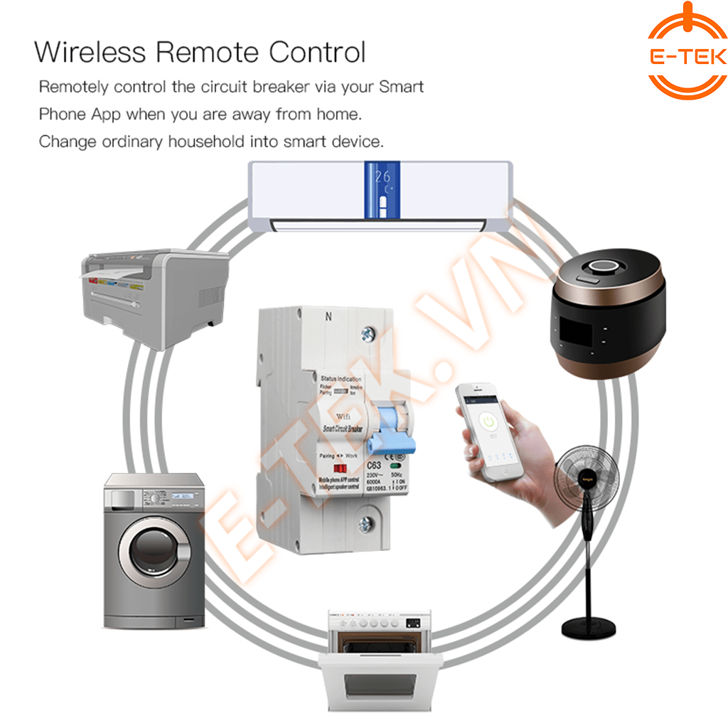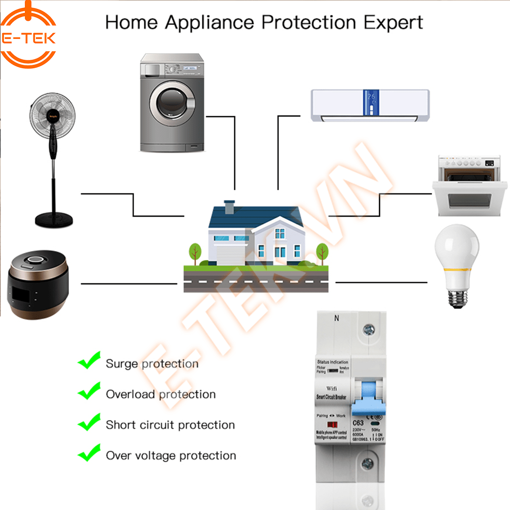 Đóng vai trò làm cầu giao tổng thông minh, kết nối đến nguồn điện tổng bảo vệ toàn bộ thiết bị điện gia dụng, Aptomat cầu dao wifi thông minh hỗ trợ chịu tải tới 100A. điện áp 50Hz,1 pha - 230V/ 3 pha - 400V