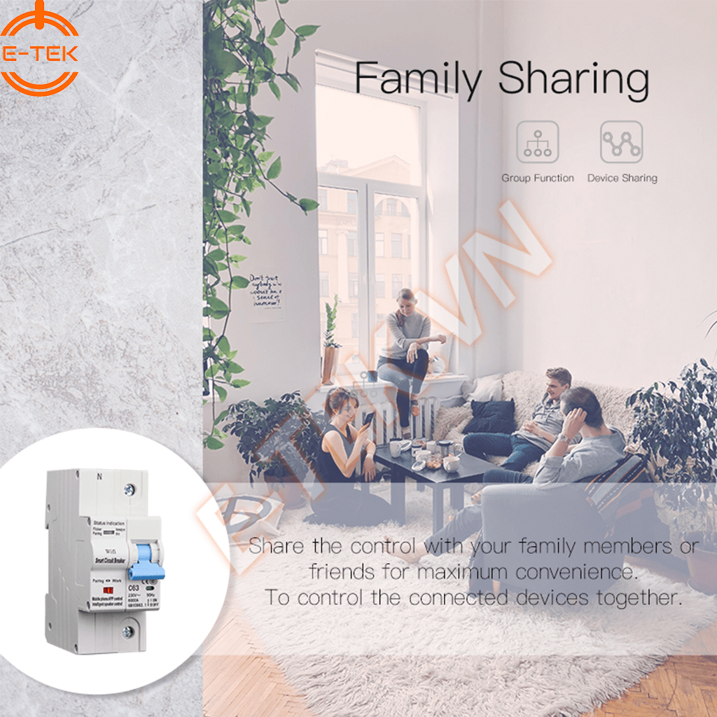 Aptomat cầu dao wifi thông minh mang đến sự linh hoạt, an toàn cho gia đình bạn qua tính năng chia sẻ quyền điều khiển qua các thiết bị di động của các thành viên.