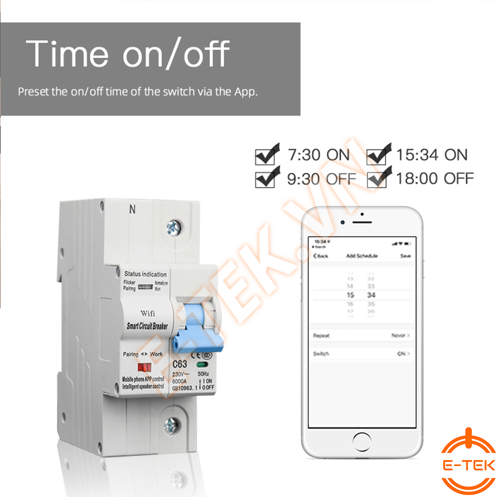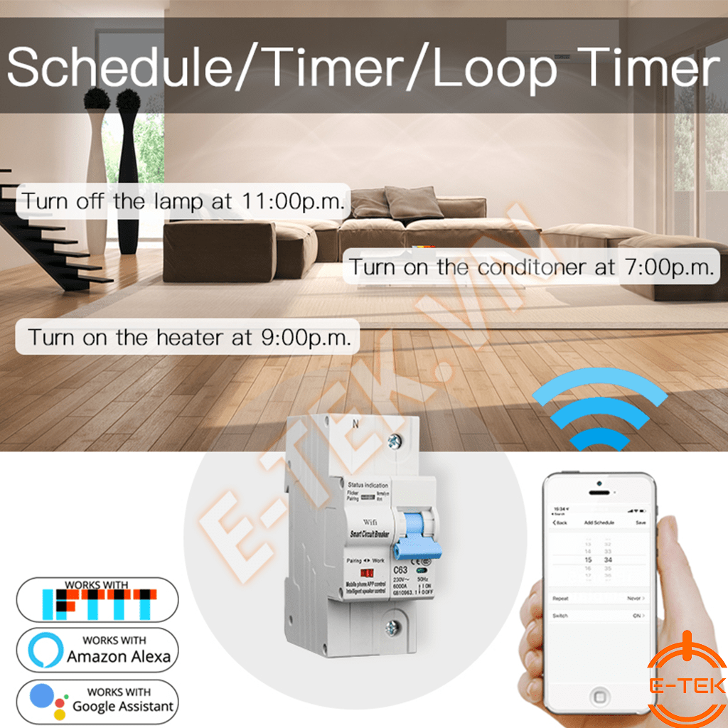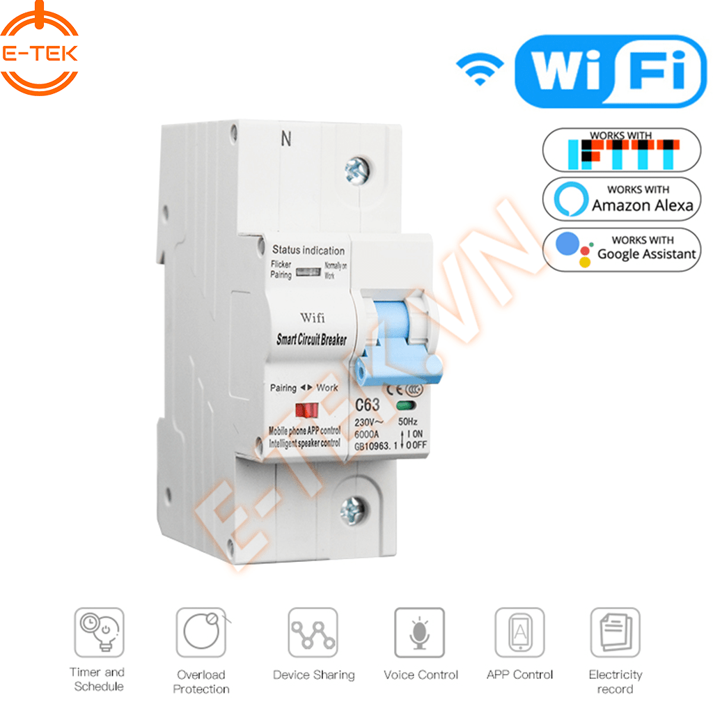 Aptomat cầu dao wifi thông minh hỗ trợ kết nối tới Amazon Alexa hoặc Google Assistant để điều khiển bằng giọng nói.