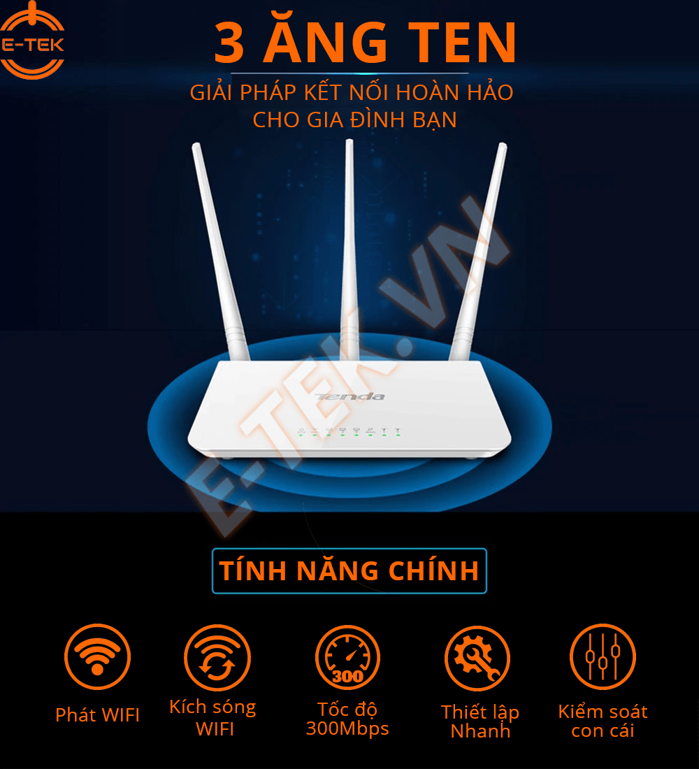 Bộ phát WIFI 3 râu, giá rẻ, Tenda F3, tốc độ kết nối 300Mbps, tích hợp tính năng bộ kích sóng WIFI, có tính năng kiểm soát băng thông, thời gian truy cập mạng của từng thiết bị, 3 ăng ten ngoài 5dBi.