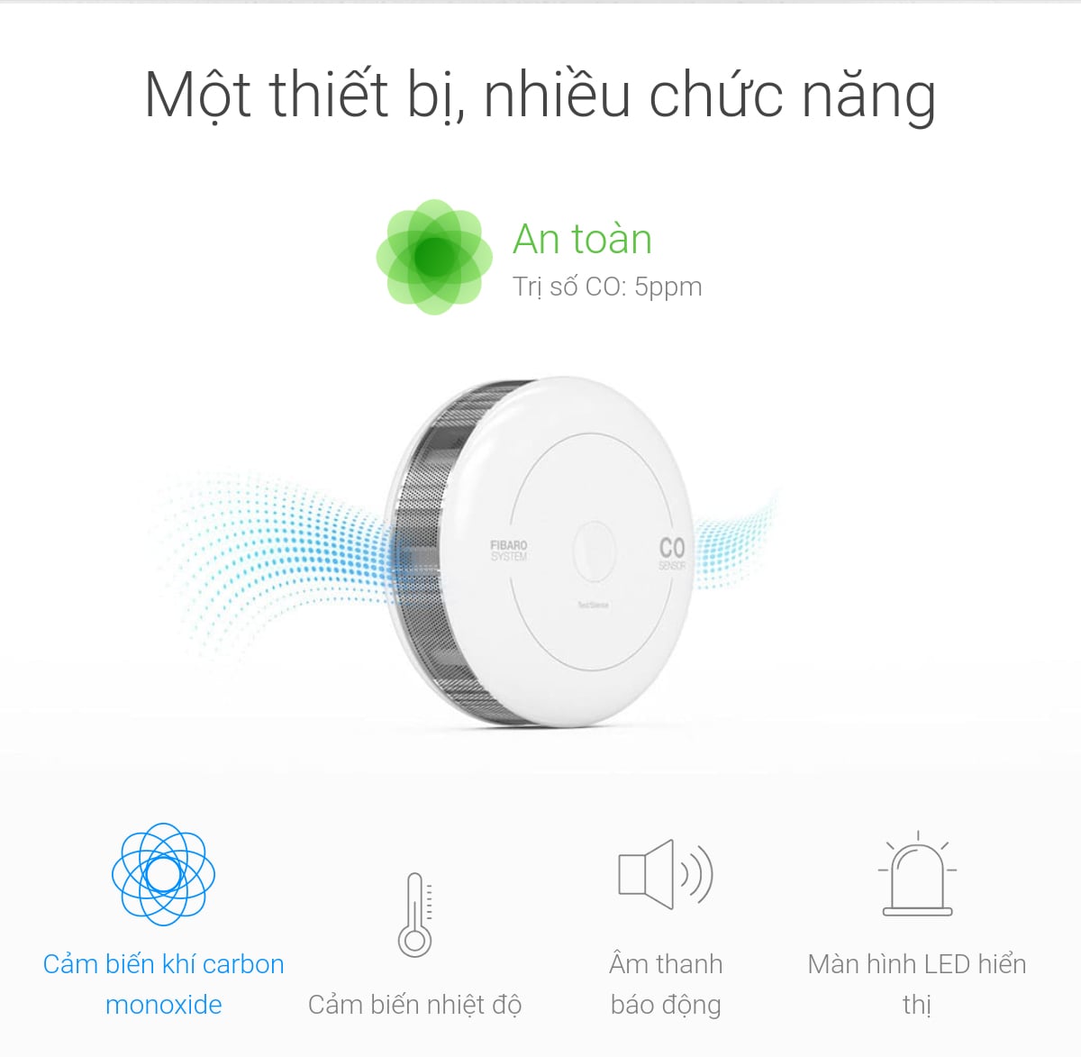 Bộ cảm biến carbon monoxide được chứng nhận với độ chính xác đo đặc biệt. Nó có thể phát hiện lượng carbon monoxide thậm chí tăng nhẹ, đủ để ảnh hưởng đến sức khỏe của bạn trong thời gian dài. Với nồng độ cao hơn, Cảm biến FIBARO CO sẽ ngay lập tức thông báo cho bạn về mối đe dọa. Cảm biến thậm chí sẽ hoạt động độc lập mà không cần kết nối vào hệ thống.