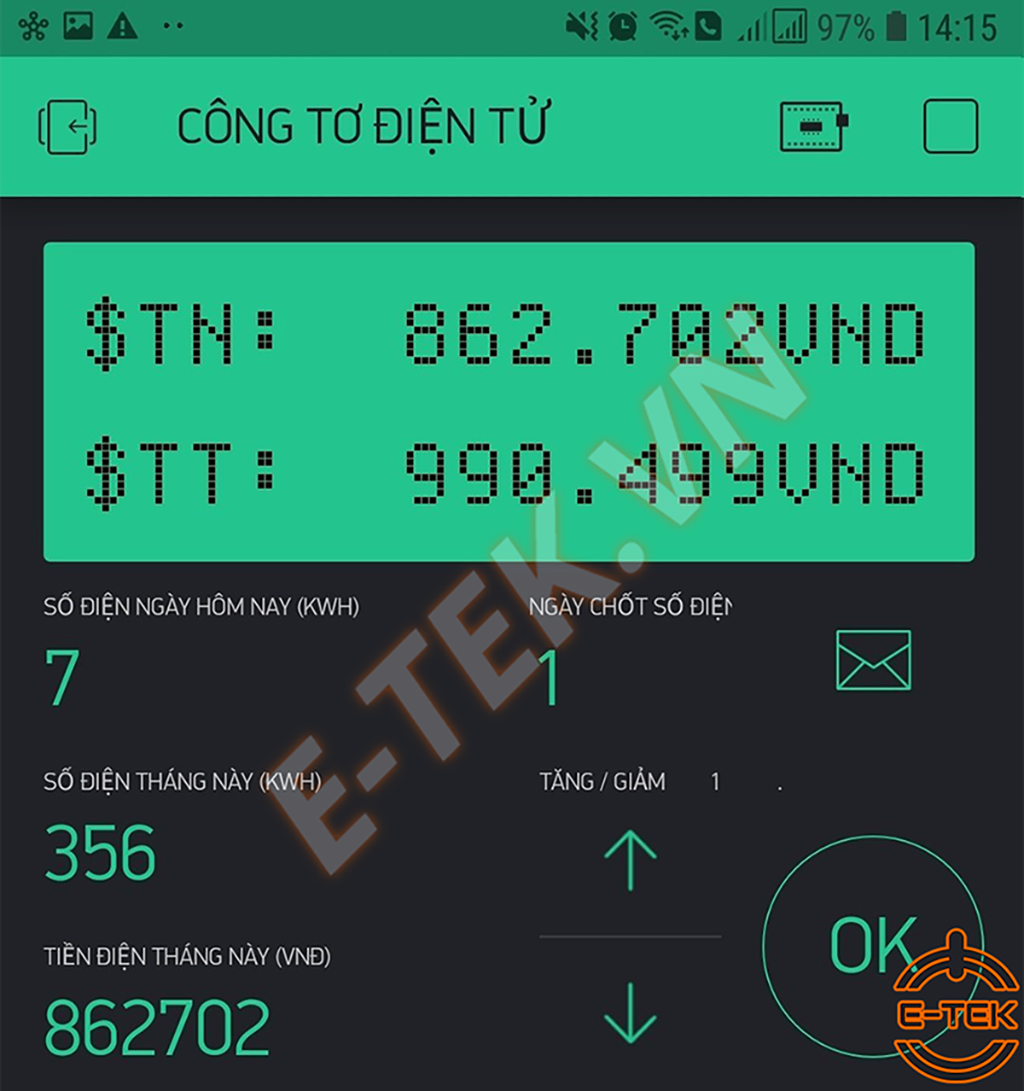 - Hàng tháng thiết bị tự động gửi email theo hòm thư được đặt về thông tin lượng điện tiêu thụ hàng tháng và số tiền tương ứng với lượng điện tiêu thụ.