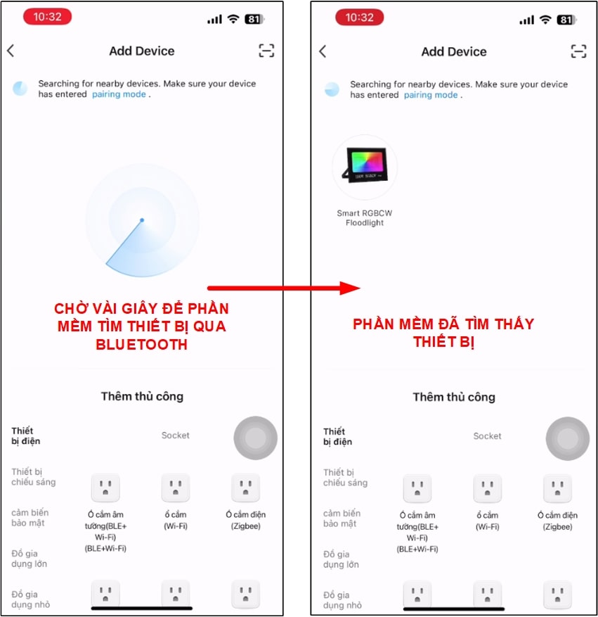 Phàn mềm sẽ tự động tìm kiếm thiết bị đèn LED RGB WIfi đổi màu, sau vài giây, trên màn hình ứng dụng sẽ hiển thị tìm thấy thiết bị Smart RGBCW Floodlight như dưới,
