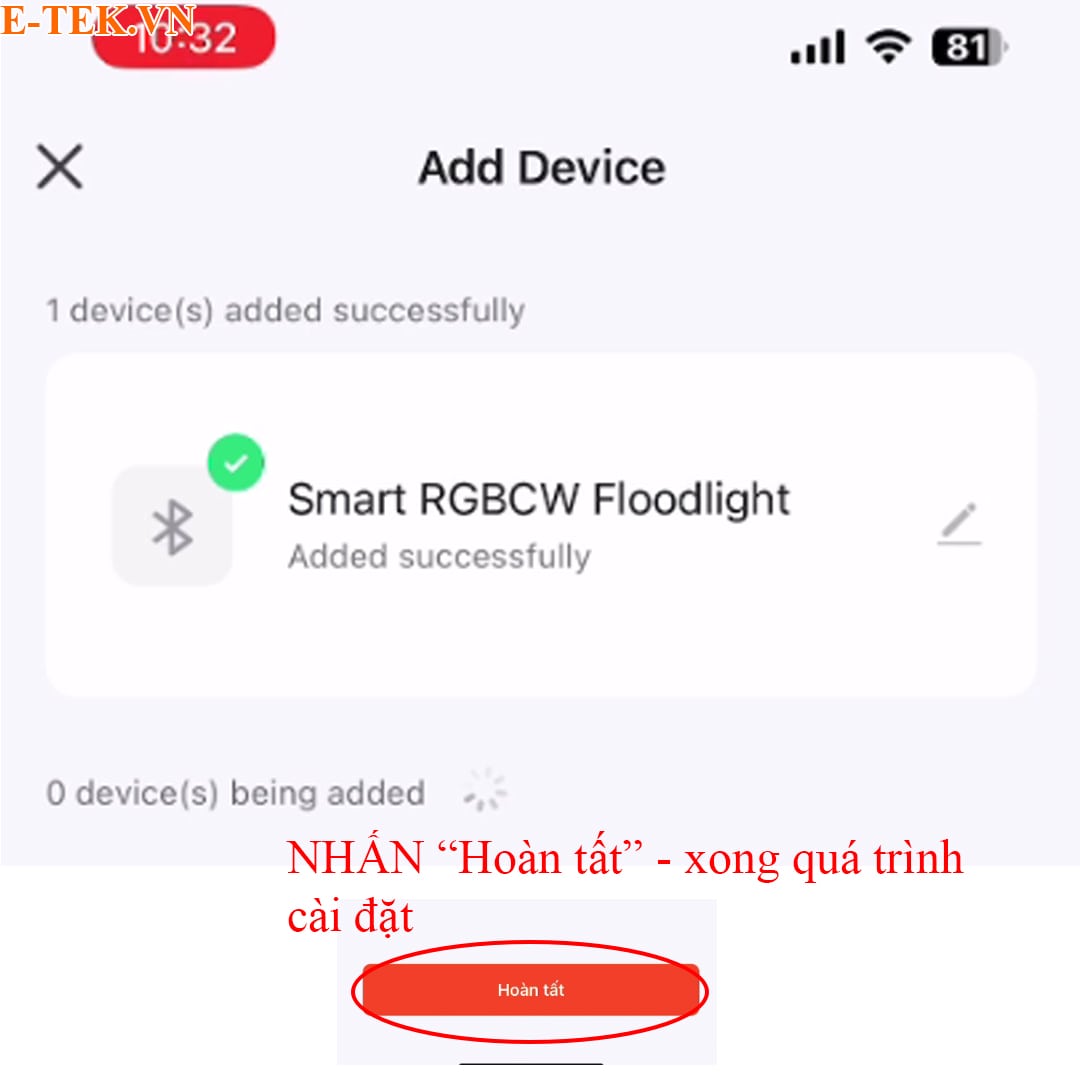 Cuối cùng bạn nhấn "Hoàn Tất" - là xong quá trình cài đặt Đèn LED RGB Wifi ngoài trời nháy theo nhạc, Vào app Tuyasmart điều khiển trên điện thoại di động
