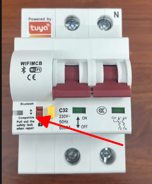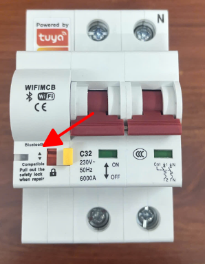 2. Chưa bật nguồn cho Atomat wifi vội, cần làm trước thao tác này: Để nút công tắc đỏ trên Aptomat wifi tuya ở chế độ: "Bluetooth"