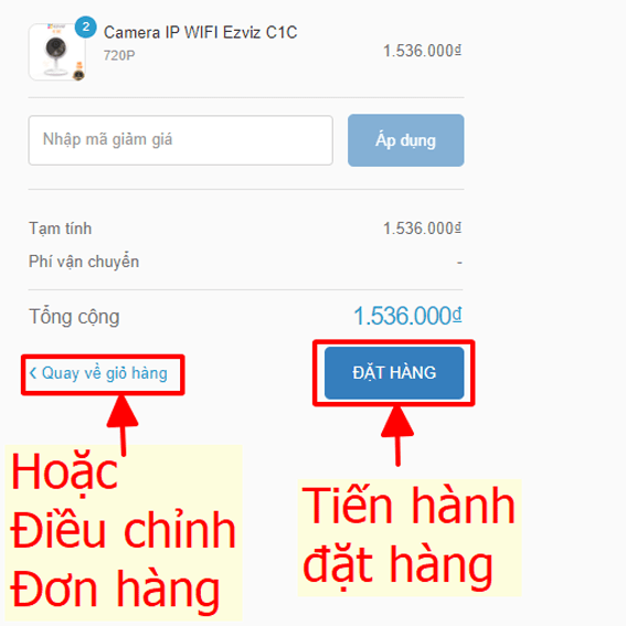 Sau khi điền đầy đủ thông tin, khách hàng hoàn thiện đặt hàng bằng việc thực hiện click nút "ĐẶT HÀNG" Hoặc nếu muốn thay đổi số lượng, chủng loại thiết bị, thì cập nhật lại đơn hàng trong mục: "Quay lại giỏ hàng".