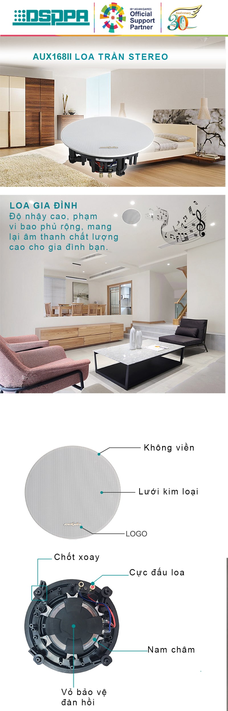 AUX168II là loa âm trần âm thanh nổi 20W 8Ω vỏ nhựa chất lượng cao và thiết kế đẹp mắt, các cực đấu nhỏ gọn và tinh tế, hoàn toàn phù hợp với gu thời trang tân cổ điển của gia đình hiện đại.
