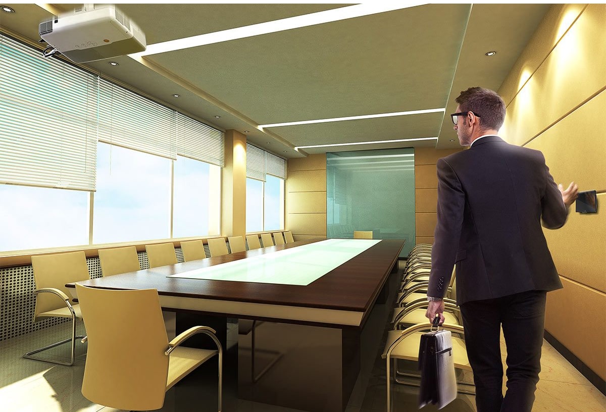 Nơi làm việc được gọi là ngôi nhà thứ hai là có lý do. Đó là nơi chúng tôi dành phần lớn thời gian của mình. Màn hiền điều khiển Fibaro sẽ giúp bạn tạo ra một môi trường xung quanh thân thiện và làm cho văn phòng thoải mái như chính ngôi nhà của bạn. Điều khiển rèm, đèn hoặc máy chiếu - mọi thứ bằng cử chỉ của tay bạn.