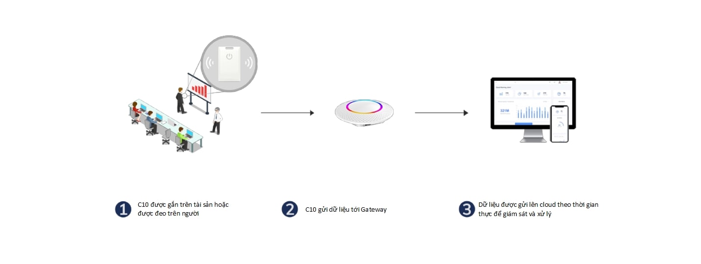 C10 cho phép theo dõi tài sản thông qua việc cài hoặc lắp nó lên trên trên các tài sản cần quản lý. Nó có thể được gắn chặt bằng lỗ móc chìa khóa hoặc dán trên tài sản để có thể định vị và theo dõi theo thời gian thực, ngăn ngừa mất mát và nâng cao hiệu quả làm việc.